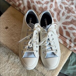 Classic Converse sneakers with a white canvas and light blue accents. Ideal for everyday style.
