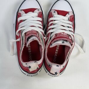 This product is a classic pair of Converse All Star low top shoes in red, with stars as the theme. The shoes are in a youth size 12 (UK size 1) and feature a lace-up closure. Made from canvas, these sneakers are part of the Converse All Star product line, making them a stylish and comfortable choice for any casual outfit. Perfect for both boys and girls, these iconic shoes are a timeless addition to any wardrobe.