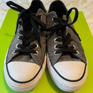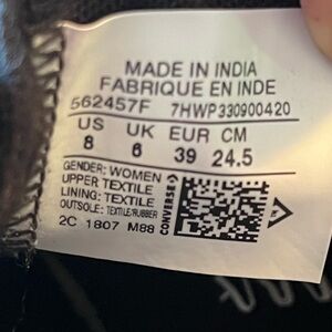 These low tops have a double tongue, a black Converse label on one of the tongues and a black patient leather pull on tan in back.