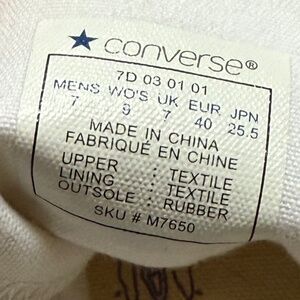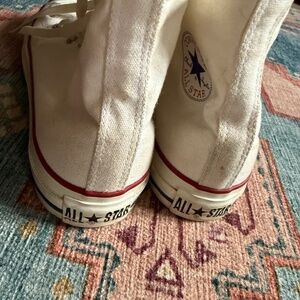 Men's size 7, women's size 9, Chuck Taylor high tops. Older style, more classic look. Some slight discoloration on the left shoe, very minor.