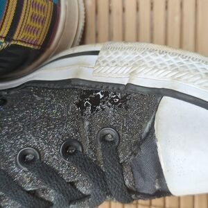 Converse All Stars black leather high tops fashion sneakers. Men's 7. Wo's 9. Repair spot on toe box. see last pic. A32pm
