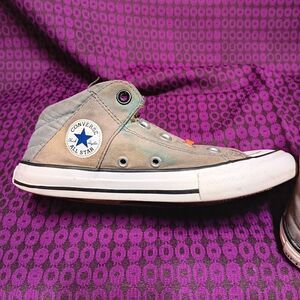Tan Converse All Stars. Boys size 2. They do have some light discoloration on inside of both shoes. In used but still good condition.