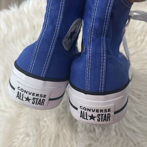 Stylish Converse All Star Chuck Taylor high-top sneakers. Vibrant blue canvas with white laces and toe cap. Iconic design for casual wear.size 8 good condition smoke free home