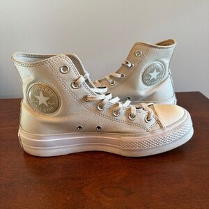 Stylish Converse high-top sneakers. Cream color with classic design. Durable and comfortable.