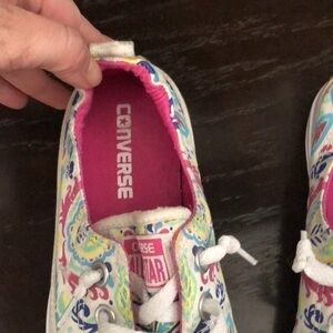 Converse Allstar Size 4 US 6. And gently used condition, signs of wear as pictured. Top fabric feels like denim and has a very cute, dainty multicolor print. There’s an elastic stretchy part at the heel.