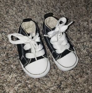 Classic Converse kids shoes. Black canvas with white laces. Iconic logo on the side.