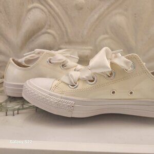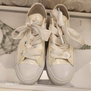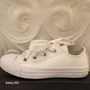 Converse Big Eyelets Patent Leather Low white sneakers. NIB. Size 6. Glossy light white/cream (depends on the lighting) with white ribbon/satin laces. A few dirt markings along the backs. No wear, assuming a return or floor model. Box has minor damage. Smoke free home. No odors. All offers are welcome. Thank you!