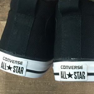 Converse Black Canvas Slip-On Mid-Top Sneakers. Excellent like new condition. Rubber looks brand new. All star mid-tops slip on/off easily. No tying of laces necessary.