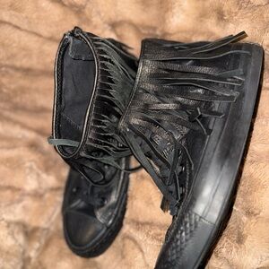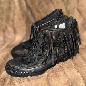 These Converse sneakers feature a striking black design with a unique fringe detail that adds a touch of flair. Crafted from a soft suede-like material, they provide both comfort and style. The durable rubber sole ensures they are perfect for everyday casual wear.