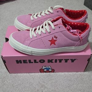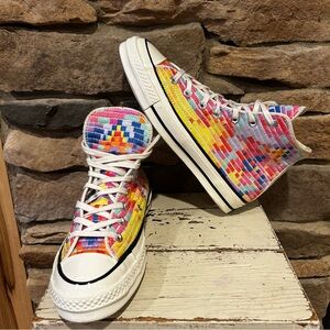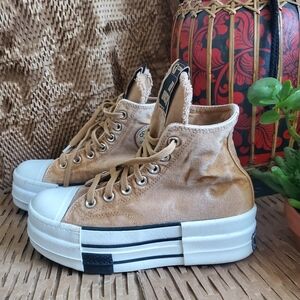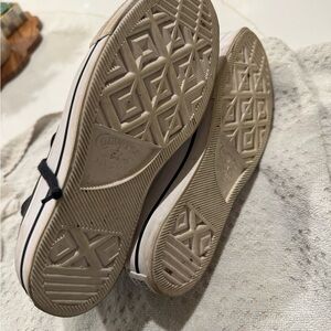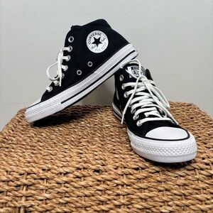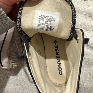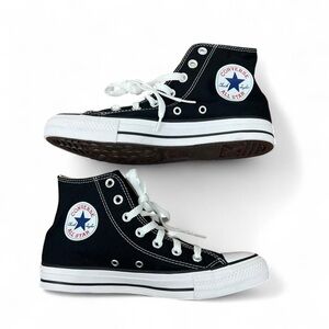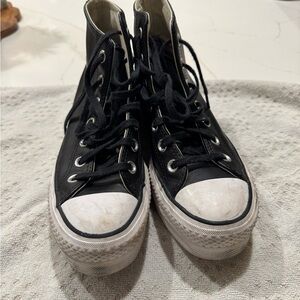 Classic Converse high-tops in black and white. Iconic design with durable canvas. Platform leather size 6