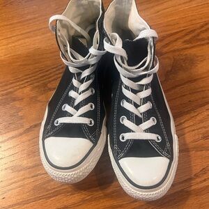 Sleek black high-tops with white accents. Features classic Converse logo.
