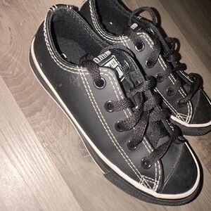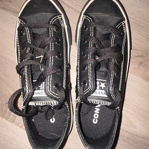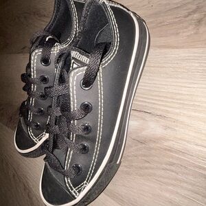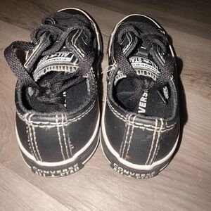 These Converse sneakers boast a sleek black canvas upper with subtle white detailing, including a durable rubber sole. Designed in a classic low-top style, they offer a versatile and casual look perfect for everyday wear.