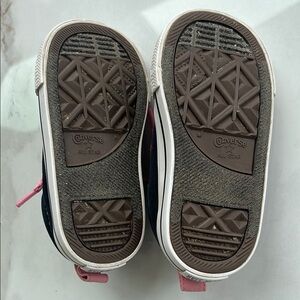 These Converse sneakers combine a classic silhouette with a playful mix of black and pink colors. Crafted from durable canvas, they feature white rubber toe caps and soles for a timeless look. Perfect for adding a touch of style to any casual outfit.