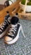 Stylish high-top sneakers. Classic black and white design. Iconic Converse logo on the side. Durable rubber sole.