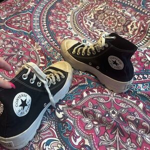 Classic Converse high-tops. Black canvas with white accents. Timeless style for any casual look. In fair condition still has life left in them, but are not in 100% condition. I would say the condition is five out of 10.