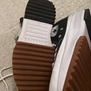 Stylish high-top sneakers. Black canvas with white accents. Chunky platform sole. Iconic Converse logo. Worn once