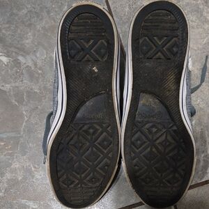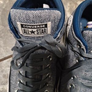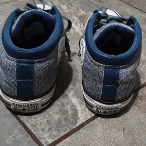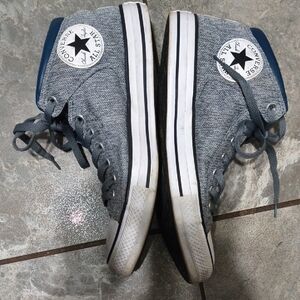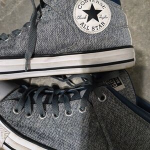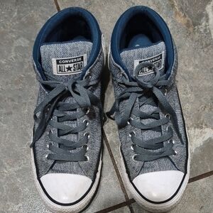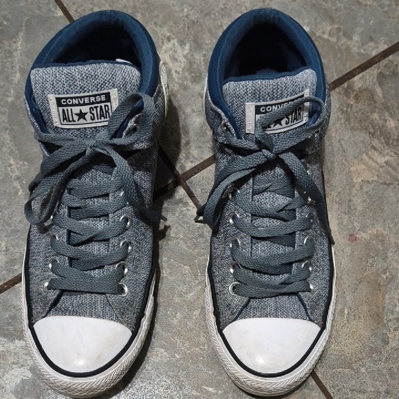 Stylish all star Converse high-tops. Blue and grey fabric with white toe caps. Classic design with grey lace-up closure. as is, final sale, size 8.