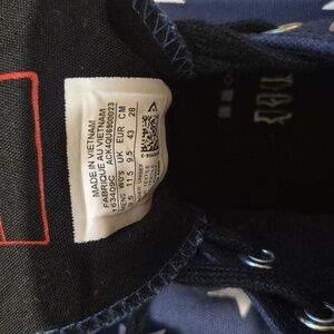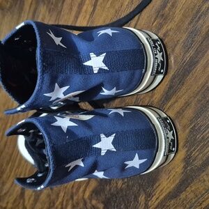 Stylish Converse sneakers with a blue canvas and white star pattern. Features black laces and a classic white sole.