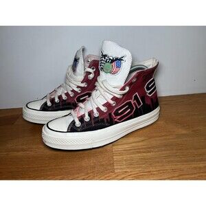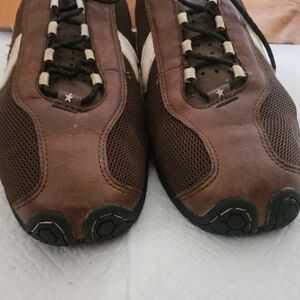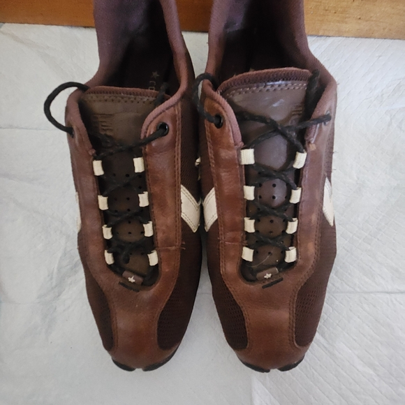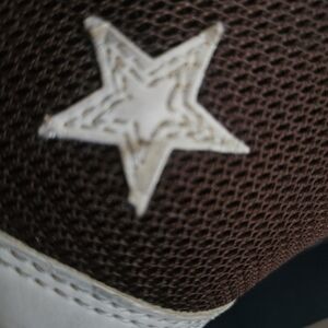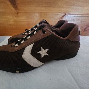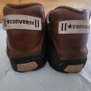Converse sneakers crafted in rich brown leather. Features distinctive white highlights and unique lace pattern.