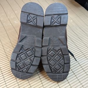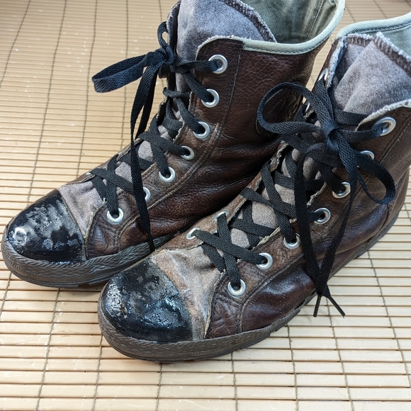 Stylish high-top sneakers. Brown leather with black accents. Lace-up design. Iconic Converse look.