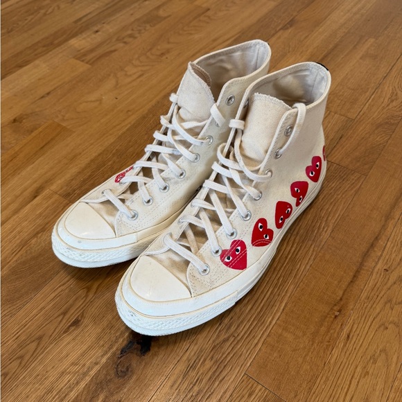 Chic high-top sneakers with charming red heart details. Ideal for a playful style.