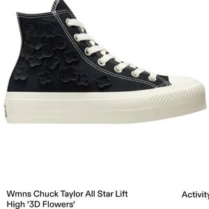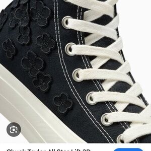 HIGH TOP CONVERSE CHUCK TAYLOR IN BLACK, WITH BLACK 3D FLOWERS ON SIDE PANELS. CREAM PLATFORM SOLES AND CREAM LACES. PLATFORM IS APPROX. 1.5"