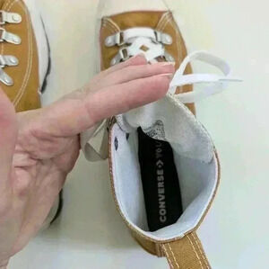 These Converse High Top mustard colored sneakers are in near perfect condition. There are a few very light scuffs on the white rubber, otherwise they are in perfect shape.