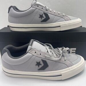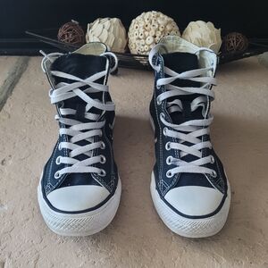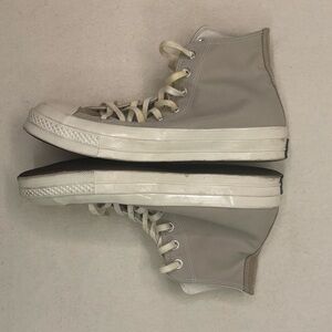 Chic Converse high-tops with a cream and gray palette. Features classic lace-up style.