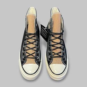 Note: These Converse Chuck 70 high tops offer a bold yet versatile look with a touch of shimmer. Perfect for casual streetwear with a twist. Please note that glitter detailing may naturally shed slightly over time. Colors may appear slightly different in lighting.