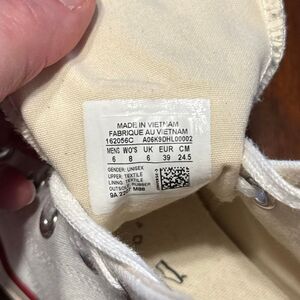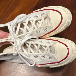 Good condition white canvas Converse lace up shoes Chuck 70 high tops. Light signs of wear on shoes and laces. THESE RUN SMALL!!!! They fit more like a converse women’s 7.5 than an 8. Women’s size US 8 Men’s 6 EU 39