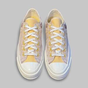 Note: These limited edition Converse Chuck 70 sneakers feature a beautiful embroidered floral design in soft yellow and cream tones, perfect for adding a cheerful, vintage vibe to your wardrobe. Please review all photos for condition and color details, as lighting may slightly affect appearance.