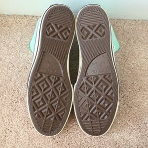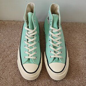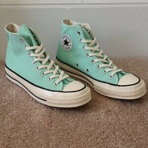 Practically new pair of Converse Chuck 70 Sneakers in “Prism Green/Egret/Black” colorway. Inside size tag states women’s size 9.5, men’s size 7.5.
