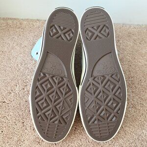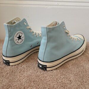 Practically new pair of Converse Chuck 70 Sneakers in “Soft Juniper/Egret/Black” colorway. Inside size tag states women’s size 9.5, men’s size 7.5.