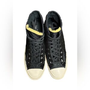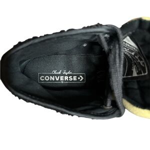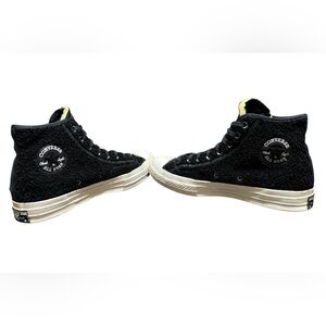 Elevate your look with these stylish Converse chunk 70 Varsity Sherpa high-tops. Sleek black design with classic white accents,Size M8.5,W10.5,Made in Vietnam,Used in Good Condition, The white sole looks a little yellow and worn from use; please see the photos,Open to Offers