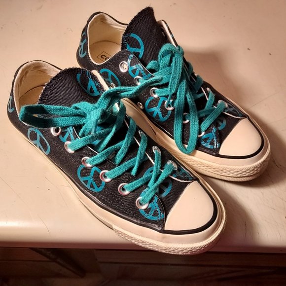 Coming in the form of the brand’s premium ‘70 edition of the low-top silhouette, the new “Peace” release serves as a nod of sorts to the hippie subculture of the late ’60s and early ’70s in America. These were tried on and didnt fit right, as you see Im listing them as new, they are blue with green peace signs and green laces.