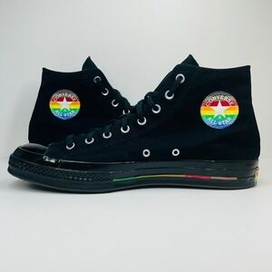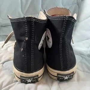 Converse Chuck Taylor All Star 70 High Top sneakers in a classic black canvas finish. These iconic shoes feature the vintage-inspired Chuck 70 details, including a higher rubber siding, cushioned footbed, and substantial rubber toe cap. The heavy-duty canvas upper is accented with contrast stitching and the signature star ankle patch. Designed for durability and timeless style, these high tops offer a more structured fit than the standard All Star model.