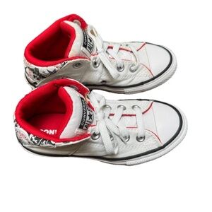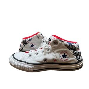 These Converse Chuck Taylor All Star Axel Patchwork sneakers for boys/youth are white with a red interior lining and an all-over patchwork pattern in red, white, and blue featuring the Converse logo. The shoes are a youth US size 13. They have a lace-up front and a mid-top style.