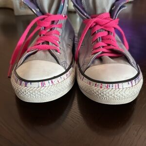 These Converse sneakers feature a striking combination of gray and pink, with a classic high-top design. The vibrant pink laces add a pop of color against the neutral gray canvas, while the signature white rubber toe cap and sole complete the iconic look. Perfect for making a bold statement with every step.