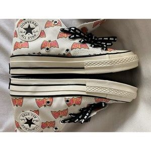The product is a limited edition Converse Chuck 70 sneaker celebrating Batman's 80th Anniversary. It features a high top shoe shaft style in a multicolor design of Egret, Pink, and Black. The size is Men's 5, and it is part of the Converse Chuck 70 product line. The style code is 167318C, and the release date was October 22, 2019. This special edition shoe pays homage to the iconic superhero with a unique color scheme and design that fans of Batman and Converse sneakers will appreciate. Preowned no signs of wear, absolutely excellent condition.