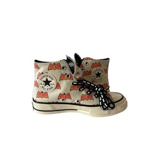 The product is a limited edition Converse Chuck 70 sneaker celebrating Batman's 80th Anniversary. It features a high top shoe shaft style in a multicolor design of Egret, Pink, and Black. The size is Men's 5, and it is part of the Converse Chuck 70 product line. The style code is 167318C, and the release date was October 22, 2019. This special edition shoe pays homage to the iconic superhero with a unique color scheme and design that fans of Batman and Converse sneakers will appreciate. Preowned no signs of wear, absolutely excellent condition.