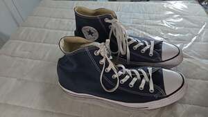 Classic Converse Chuck Taylor All Star High Top Sneakers in Navy Blue. These iconic shoes feature a durable canvas upper, the signature star ankle patch, and a vulcanized rubber sole for comfort and grip. A timeless streetwear staple that pairs well with denim or shorts.