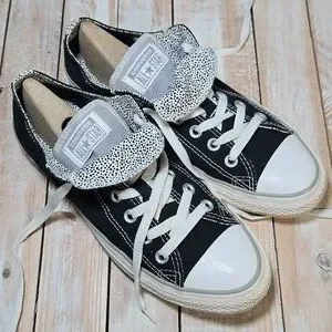 This specific model is a playful variation of the classic Chuck Taylor silhouette, featuring a unique double tongue design and a black-and-white polka dot pattern on the lining and inner tongue.