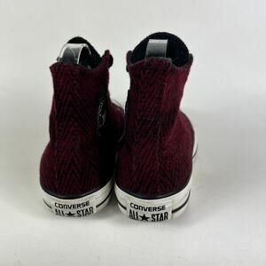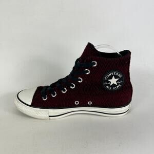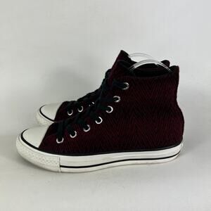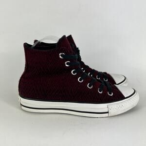 preowned. Elevate your sneaker game with these women’s Converse Chuck Taylor All Star High sneakers in red with a zig-zag pattern. These shoes feature a lace-up closure and high-top shoe shaft style for a secure fit, while the breathable canvas lining and foam insole provide all-day comfort. The rubber outsole ensures durability and excellent grip for skateboarding or casual wear. These versatile shoes are perfect for any season, whether it's winter, summer, fall, or spring. The Converse Chuck Taylor All Star High sneakers are a great addition to your collection, with a stylish chevron pattern and star theme.