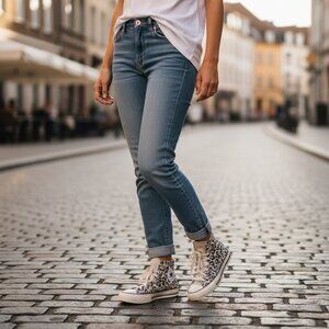 Step out in bold style with these Converse Chuck Taylor All Star high top sneakers featuring a striking leopard print design. Known for their classic silhouette and durable canvas build, these shoes blend iconic Converse heritage with a modern, edgy twist. Designed as a unisex style, they fit Women’s size 7 and Men’s size 5, offering versatility for everyday wear. With cushioned insoles and sturdy rubber soles, they provide comfort and support for casual outings, concerts, or streetwear looks. Pre-loved, in good plus condition, showing light normal wear, these sneakers remain a fashionable and functional choice for any wardrobe.