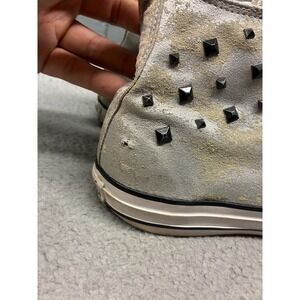 Condition: Metallic uppers show heavy wear with scuffs and hole. Studs are intact with light wear. Soles and midsoles show use, with some heel wear (see photos).