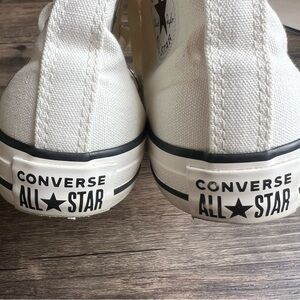 These Converse sneakers feature a classic high-top design with a charming red heart pattern on a white canvas upper. The shoes maintain the iconic Converse silhouette with white laces, metal eyelets, and a signature rubber toe cap and sole. This shoes are almost new, please refer to pictures to see a bit yellowish on the front toe in one shoe.