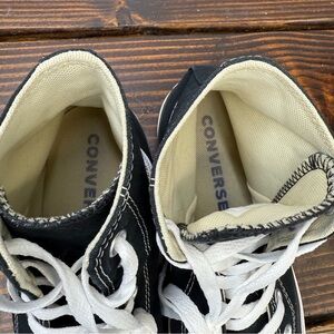 Classic black Converse Chuck Taylor All Star high-tops in excellent pre-owned condition. Clean, timeless look featuring brand-new genuine Converse white laces. Durable canvas upper with white rubber toe cap and sole — an iconic style that pairs perfectly with any outfit.