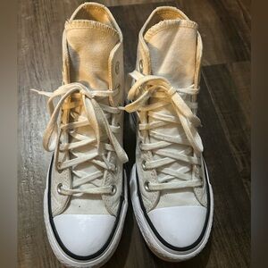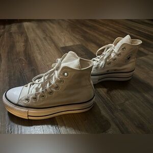 Cream Converse high-tops with cloth upper. Ideal for everyday style. These are in excellent condition and will make any girl so Happy!! Size 5 Youth. Happy Shopping