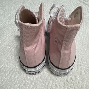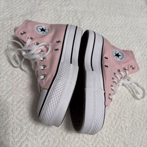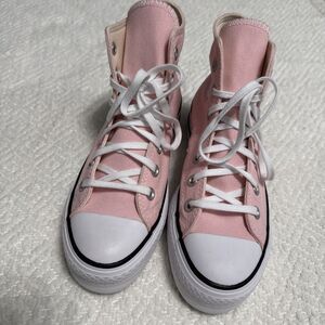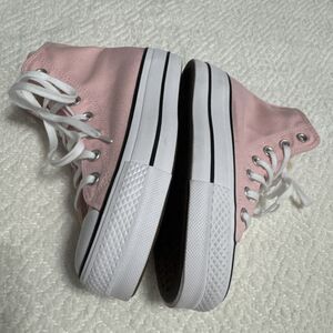 The product is a pair of Converse Chuck Taylor All Star Lift Hi Donut Glaze Platform Sneakers in women's size 6. These high-top sneakers feature a lace-up closure, canvas fabric type, and rubber outsole material. The sneakers are designed for comfort with a foam insole and platform style. They come in a pink color with a solid pattern, suitable for various occasions like activewear and casual wear. The Converse Chuck Taylor All Star sneakers are part of the 2023 release and are signed by the brand, offering a stylish and trendy option for women's athletic footwear.