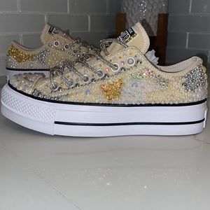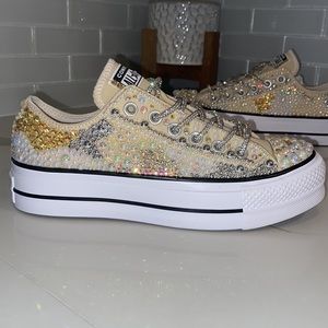 Custom Converse designed in AB White Pearls, AB Oyster Pearls, Silver Dollar Pearls, AB Rhinestones, and Sunlit Rhinestones! Shoes are topped off with beautiful AB Rhinestone laces!